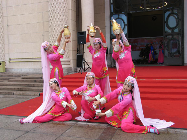 哲茲白:東鄉(xiāng)族穆夫提教派中流傳著一種歷史悠久的舞蹈叫“哲茲白”,這種舞蹈多在宗教儀式中表演,舞者均為男子,動(dòng)作以誦經(jīng)的節(jié)奏為準(zhǔn)。主要?jiǎng)幼鳛椋弘p手前后甩動(dòng)兩下,同時(shí)腳下動(dòng)兩步,然后雙手在胸前交替拍胸,這時(shí)一腿稍彎曲,另一腿向前伸出。舞蹈特點(diǎn)詼諧、幽默、灑脫。