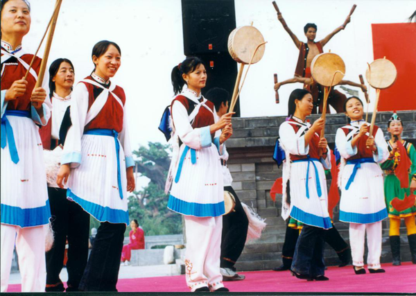 在香格里拉白地一帶的納西族女性,喜穿開敞口秀邊的長褂配百褶裙,腰系羊毛織彩帶,腳穿云頭黑靴,背披白山羊皮所制的披氈,傳統(tǒng)氐、羌系游牧民族服飾特點(diǎn)非常突出。