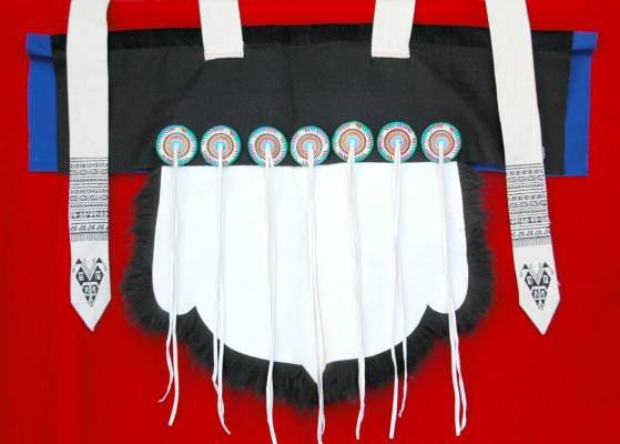 七星披肩所用材料為黑色綿羊皮,先將羊皮去毛、洗凈、硝白、縫成披肩,然后在披肩背上繡上自己縫制精美的七顆星星,每個(gè)星星中心垂下兩條布帶,整個(gè)布帶與白色寬帶相繞,帶梢端垂于后,披肩的兩角釘上兩條白布帶,勞動(dòng)時(shí)拉到胸前交叉系緊。”這樣一件精美的“披星戴月衣”是對勤勞的納西族婦女的歌頌,形如蛙身狀的披肩是古代納西族圖騰崇拜的標(biāo)志,在納西族傳統(tǒng)中,青蛙是智慧之神,反映了納西族在美學(xué)、習(xí)俗等方面形成的傳統(tǒng)觀念和心理特征。