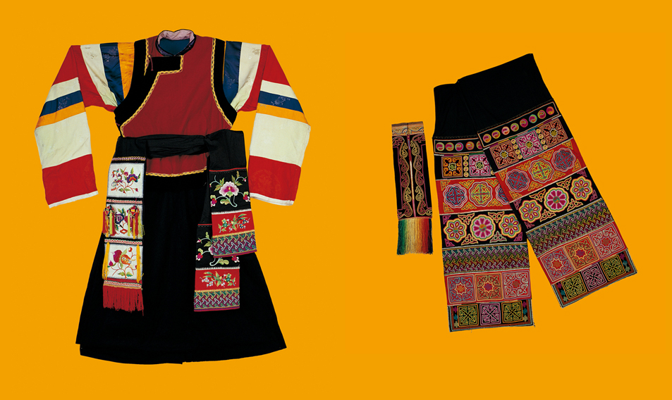 圖為青海互助土族彩袖女服與牡丹紋布腰帶,中央民族大學民族博物館館藏