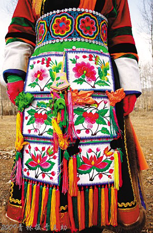 土族已婚婦女頭戴“扭達(dá)”(頭飾),身穿五色花袖衫,外套藍(lán)、黑色坎肩,勒花腰帶或褐帶,穿緋紅裙子,著繡花長腰布鞋;未婚姑娘則不戴“扭達(dá)”,不穿緋紅裙子,頭發(fā)不挽髻,只梳兩條小辮子,中間梳大辮子,三條辮子合辮成一條,用紅頭繩扎緊,上系兩枝小海螺;老年婦女只梳兩條辮子,辮梢系在一起,垂在背后,只戴卷邊氈帽,一般不戴“扭達(dá)”,不穿花袖衫,也不穿緋紅裙子,腰帶以黑布為多。