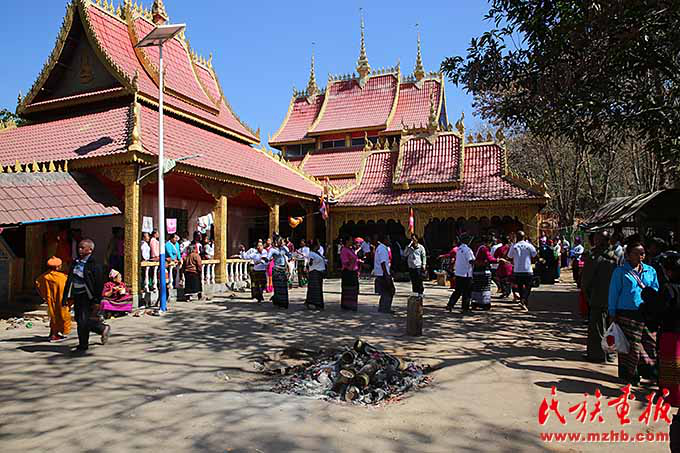 生活在我國西南邊疆的布朗族節(jié)日期間要舉行很多文化活動,布朗族同胞與親朋好友相聚一堂,品嘗美味佳肴并舉行歌舞表演。臨近中午,位于曼夕村前山頂?shù)乃聫R已人頭涌動,院子里人們圍成圈邊打鼓邊跳舞,緩緩移動的優(yōu)美舞姿成為一道靚麗的風景。