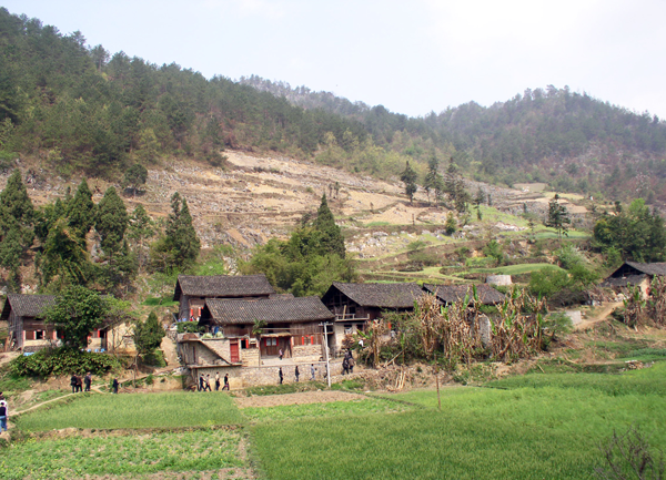 毛南族的村落多依山而立,少占耕地。干欄群落是毛南族村莊的一種布局,但形式不拘一格,根據(jù)地形特點而富有變化。有的從山腰往下建成輻射式群落,即幾座房子前后用“天橋”串聯(lián)起來,組成串聯(lián)式干欄群,這是同一宗族兄弟常采用的一種方式。有的則建立并聯(lián)式群落,即由若干間干欄房子排成兩行,中間留一條通道,兩端置圍墻與院門,圍成長形院落。也有從實際地形出,把房屋排成梯級式干欄群或擺成一字長蛇形的。此外,有的在幾座并排的房子中間開通方便門,以利叔伯兄弟及鄰里串門聯(lián)系,相互關(guān)照,形成一種向心力。村中巷道皆用石板鋪就。村邊興種竹木擋風,綠化美化環(huán)境。村頭奇特的大樹被視為村、峒守護神樹,神圣不可冒犯,一旦遇有瘟疫等異常事件,病家抑或全村皆到大樹下祭神禳解。各村屯的村背面都有大片護村林,既防石頭滾落,又美化村景,此林不允許隨意砍伐。同時,自然屯大都設(shè)立集體活動場所,在水井、溪邊、道旁或大樹下擺放石凳,供人們節(jié)日及閑暇時間聚會、娛樂。