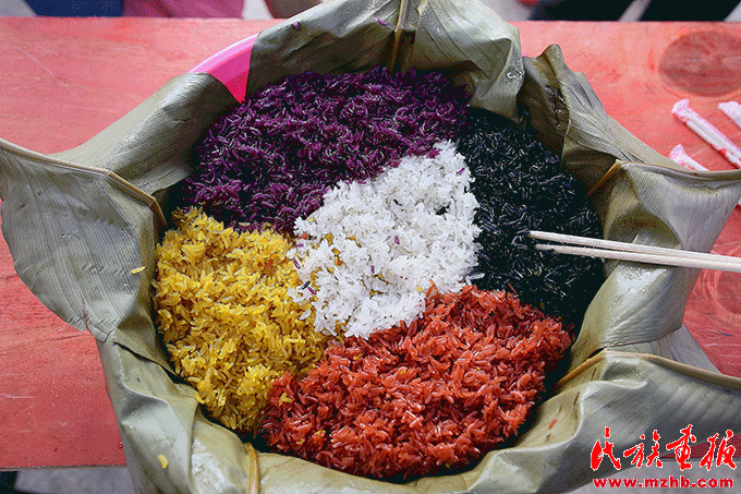 南方稻作民族將糯米用紫蕃藤、黃花、楓葉、紅藍(lán)草等泡染后再蒸煮出紅、黃、黑、白、紫的五色糯米飯,五色糯米飯一般在重要的節(jié)日中食用,以求吉祥。李琳攝影 引自民族畫報(bào)