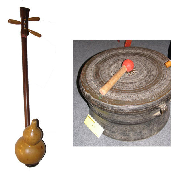 毛南族的歌舞比較簡單,樂器也不多,主要伴奏樂器有長鼓(也叫黃泥鼓、祥鼓)、木鼓、手鼓、铓鑼、小銅鑼,另外有時(shí)還用到鈸、木魚和碰鈴,古時(shí)還用嗩吶、簫、笛等(左圖為毛南族葫蘆琴)。