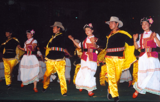 普米族的民間娛樂舞蹈,普遍具有歌、舞、樂三位一體的特點。舞蹈形式正如普米族民歌所唱的:“如金線把珍珠穿成一串,手拉手跳成十五的月亮。”娛樂舞蹈全是手拉手轉(zhuǎn)圓圈的舞蹈形式。人們挽手而跳,伴以高亢洪亮、情感激越的唱詞。特別是普米族婦女雪白的長裙隨舞步輕盈飄旋,似白鷺翻飛,正如《打跳歌》中所唱的:“笛聲不停莫歇腳,舞場上沒有陡巖子,腳底板下沒有刺,跳它個地動山也搖。”在喜慶的集會之夜,歡快的娛樂性舞蹈,往往一跳就是通宵達旦。跳鍋莊是普米族傳統(tǒng)的舞跳形式,這種舞蹈不受時間空間的限制,只要一支竹笛或葫蘆笙,有一塊空地即可進行,少則三五人,多則數(shù)百人。一般總是在傍晚,在院內(nèi)或場壩上舉行。跳舞時,總要在中間燃起一堆火,與室內(nèi)的鍋莊相似,所以稱之為鍋莊舞。鍋樁內(nèi)容很豐富,從古代的游牧、狩獵、紡織到今天的趕街、慶豐收、烤酒等都有反映。流行的曲調(diào)有《放單調(diào)》《出山》《獅子舞》等等。現(xiàn)在,鍋莊舞已發(fā)展成為集唱詞、曲調(diào)、舞蹈、音樂于一體的綜合性歌舞藝術。