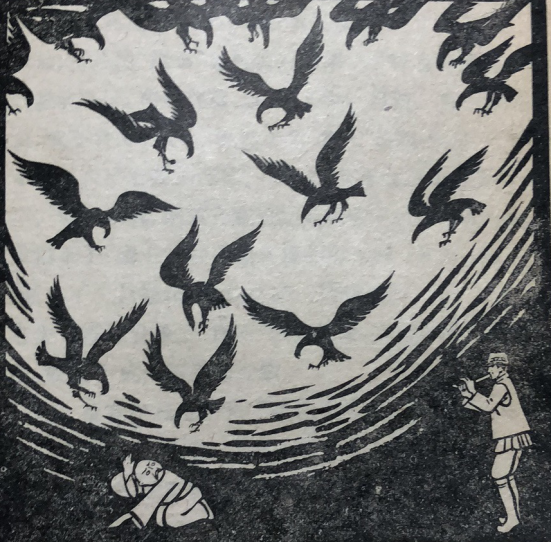 誰(shuí)知笛聲一響,成群的兀鷹像是聽(tīng)了誰(shuí)的召喚,黑壓壓的一大片,直往奴隸主頭上飛來(lái)。奴隸主知道,只要鷹落下來(lái),自己就沒(méi)命了,便急忙向娃發(fā)求饒道:“快把鷹叫開(kāi),你要啥我給啥!”娃發(fā)隨口說(shuō)道:“給達(dá)卜達(dá)爾的塔吉克人每家十只羊,十頭牛,十峰駱駝,行嗎?”奴隸主連忙點(diǎn)頭:“行!行!要什么都給。”這時(shí),娃發(fā)又吹起了“鷹笛”,鷹群才飛走了。