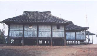 鎮(zhèn)康地區(qū)若干小家庭同住一幢房子,房內(nèi)中間有寬敞的走道,兩旁為各小家庭住室,間壁而居,各有火塘,所以竹樓較大,有的占地近四百平方米。這種干欄式長方形大屋居住形式源于過去德昂族地區(qū)仍保留父系大家族社會(huì)組織,也就是說有血緣關(guān)系的后代都共同居住在一所大房子內(nèi),房屋的大小要依據(jù)家庭成員多少而定。雖然隨著社會(huì)的發(fā)展和大家庭生活方式的改變而瓦解消失,但在解放初期還能看到它們的遺址或縮小了的原型。