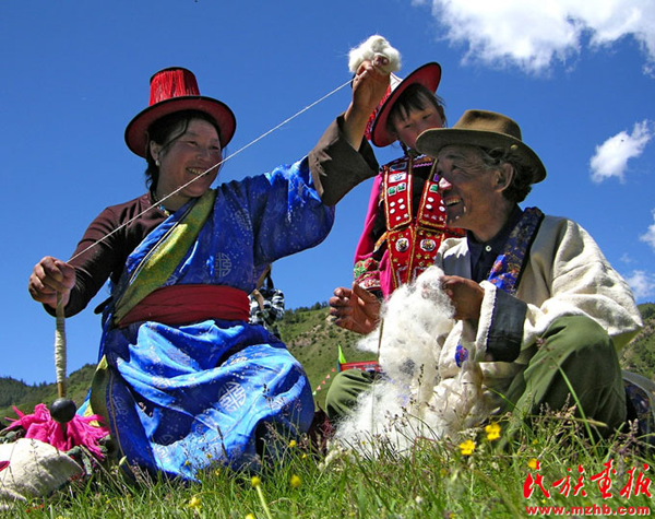 在放牧?xí)r裕固人常常捻羊毛。 央金 攝影 引自民族畫報(bào)