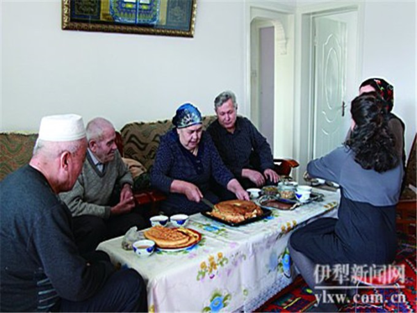整個制作過程,兩個老人有一搭沒一搭地聊著天,準備食材,互相搭把著手。屋外客廳里,她們的丈夫一邊看著電視一邊等,其樂融融,倒讓人感覺到一種歲月靜好的美感。待屋子里到處都飄蕩著拜列西濃烈誘人的香味時,大家的味蕾都被調動起來。就在這當兒,買斯胡旦的弟弟帶著弟媳也來了。兩口子熱鬧,一開門,爽朗的笑聲就飄進門。弟媳說:“嗨,我這兩個姐姐手可是巧得很!”弟弟說:“做了這么好吃的東西,沒人來吃怎么能成!”
