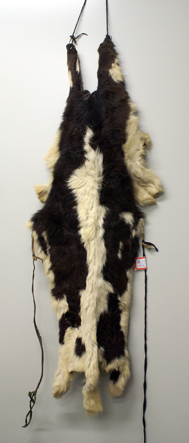 門隅南部地區(qū)的門巴族婦女,不分老少,袍服外披一張較為完整的小牛犢皮或巖羊皮,毛朝內、皮板朝外,牛皮頸部朝上,尾部朝下,略做加工、而且四肢皮伸向兩側。以此為美飾,吉慶節(jié)日或訪親會友,都要披一張新牛皮做盛裝。傳說,唐代文成公主進藏時背上披著皮子以避邪,后來此物賜給門隅婦女,后此物就成為門巴族婦女歷來沿用的裝束。