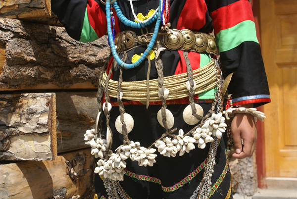 珞巴族男女都喜歡佩帶裝飾品,男子戴手鐲、竹管耳環(huán)、項(xiàng)鏈,腰間掛弓箭、長刀等物。婦女特別喜歡佩戴五顏六色的項(xiàng)珠,盛裝的婦女脖頸上有時戴十幾串到幾十串珠子,再加上手鐲、耳環(huán)、銅鈴、銀幣、鐵鏈、小刀、火鐮、海貝等飾物,有十幾斤重,可裝滿一個竹背筐,并被視為家庭財富多寡的標(biāo)志,不可缺少的嫁妝。