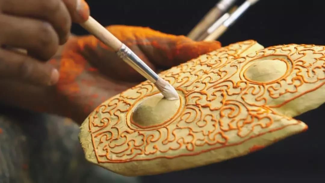 在等待膠布面具晾干的時候,扎西去到了兒子練習(xí)跳舞的地方,在外面遠遠的看著兒子練舞。原本希望兒子繼承他這手藝的心思,在看到兒子真心喜歡藏舞后,也被漸漸放了下來。回到家中,膠布面具已經(jīng)干透,開始了制作面具中最重要的一環(huán):上顏色。隨后上頭發(fā)、簪子等小零件,一個薩迦面具終于制作完成。