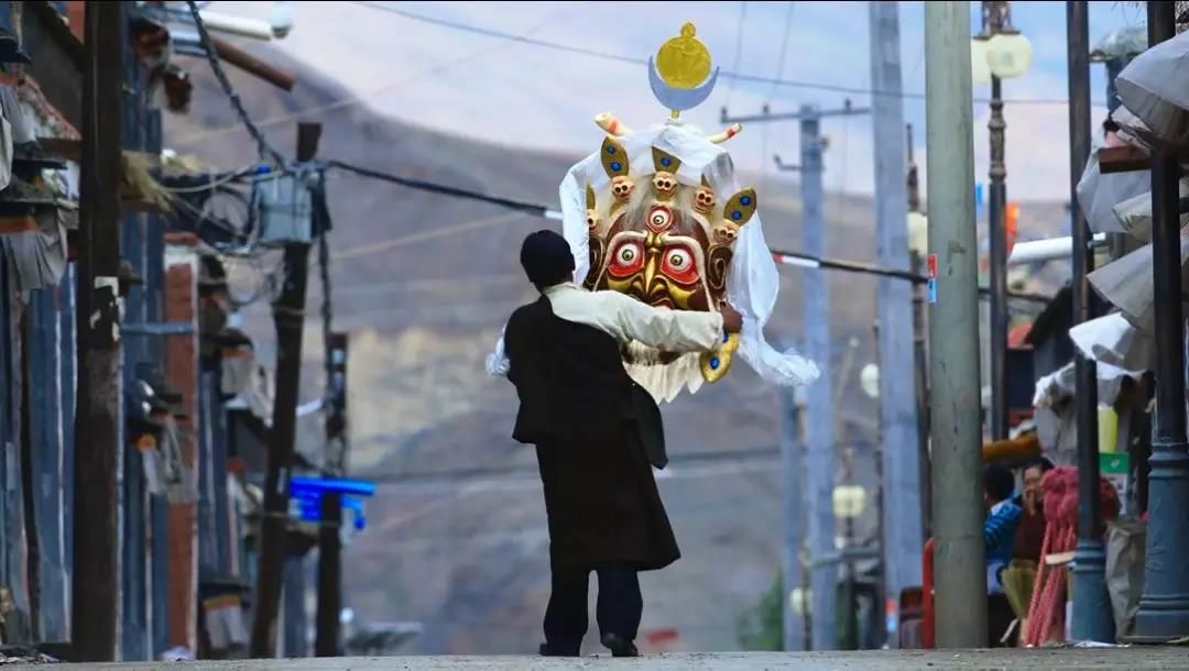 他扛著面具走出了家門,向薩迦寺的方向走去。