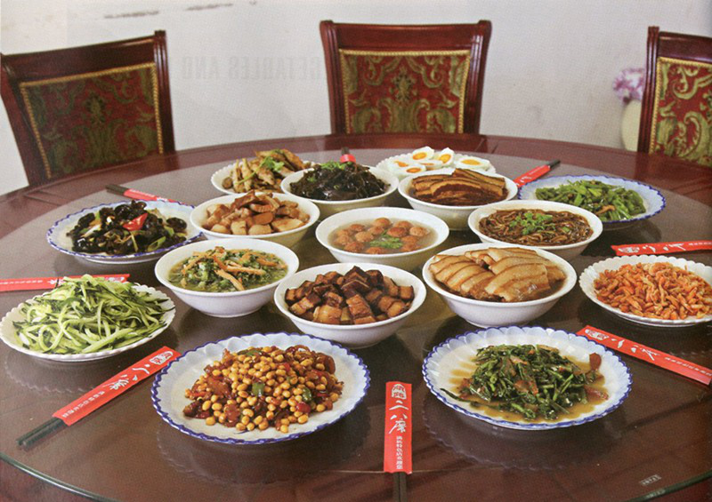 關(guān)于二八席的由來,在七道梁村是這樣流傳的:當(dāng)年,薩爾滸大捷后,努爾哈赤要求八旗各拿出一盤和一碗本旗最好的吃食,以供設(shè)宴擺席之用。于是,八旗紛紛響應(yīng),八個盤、八個碗的特色菜肴湊在一起,便有了二八席。