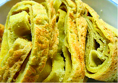 由于綠豆鍋巴的制作和原料有所不同,它的味道也不同。綠豆鍋巴粉在鍋內(nèi)烙成,呈四周薄中間稍厚,入鍋后,爐堂的松針毛毛噴噴火一燒,頓時(shí)鍋內(nèi)的鍋巴粉呈現(xiàn)出無(wú)數(shù)小氣泡,制成后切成條狀,切口有無(wú)數(shù)的小孔,像海綿狀,食用時(shí),入鹽、進(jìn)味、可口,硬香中顯現(xiàn)脆嫩,鹽香中蘊(yùn)含微甘。
