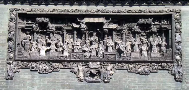 廣東磚雕按技法分淺浮雕、高浮雕和透雕,按規(guī)模分組合磚雕(先單個(gè)注模,然后組合成一個(gè)完整的圖案)和單塊磚雕。組合磚雕一般用于墻頭、柱頭、照壁等大面積的裝飾,大者需數(shù)百塊磚雕組成。單塊磚雕則常鑲嵌于神龕邊框或相飾、座飾等處。