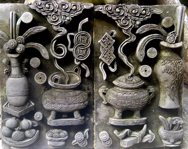 在藝術(shù)上,磚雕遠(yuǎn)近均可觀賞,具有完整的效果。在題材上,磚雕以龍鳳呈祥、和合二仙、劉海戲金蟾、三陽開泰、郭子儀作壽、麒麟送子、獅子滾繡球、松柏、蘭花、竹、山茶、菊花、荷花、鯉魚等寓意吉祥和人們所喜聞樂見的內(nèi)容為主。在雕刻技法上,主要有陰刻(刻劃輪廓,如同繪畫中的勾勒)、壓地隱起的淺浮雕、深浮雕、圓雕、鏤雕、減地平雕(陰線刻劃形象輪廓,并在形象輪廓以外的空地鑿低鏟平)等。民間磚雕從實(shí)用和觀賞的角度出發(fā),形象簡練,風(fēng)格渾厚,不盲目追求精巧和纖細(xì),以保持建筑構(gòu)件的堅(jiān)固,能經(jīng)受日曬和雨淋。