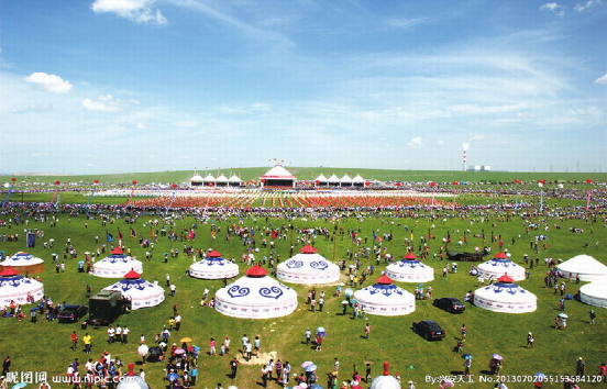 “那達慕”蒙古語為“娛樂”或“游戲”音譯。為蒙古族的傳統(tǒng)節(jié)日,據(jù)傳始于漢代。一年一度由一旗或數(shù)旗聯(lián)合在農(nóng)歷七八月舉行,每次一至數(shù)日,規(guī)模大小不一。是時正是草原上氣候怡人、綠草如茵、百花盛開、牛羊肥壯的黃金季節(jié)。節(jié)日期間,牧民們身穿節(jié)日新衣,乘馬驅車,從四面八方匯聚一處。一時草原上五彩旗幟如霞云飄掠,蒙古包如點點珍珠,一片節(jié)日氣象。大會上不僅有傳統(tǒng)的賽馬、摔跤、射箭等競技項目,拔河、藍球、下蒙古象棋等體育比賽,而且還有豐富多彩的文藝演出和琳瑯滿目的物資貿(mào)易交流。如今那達慕大會已經(jīng)成為草原上集體育比賽、文化娛樂、經(jīng)濟貿(mào)易、慶賀豐收為一體的綜合性盛大節(jié)日。
