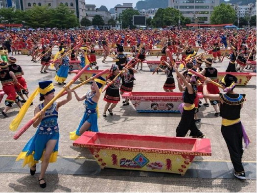打榔舞,是崇左市天等縣的壯族傳統(tǒng)民俗舞蹈,用于酬神、還愿、祭祀、娛樂等活動,起源于唐代武德年間。打榔舞主要道具為木榔,音樂響起后,每人用一米多長的木杵有節(jié)奏的敲擊榔壁、榔底和榔邊,動作歡快有力,以此來表達壯族人民對五谷豐登、六畜興旺、幸福吉祥的祈求和渴望。表演者不分男女老少,有二人對打、四人對打、多人交錯對打等多種方式。