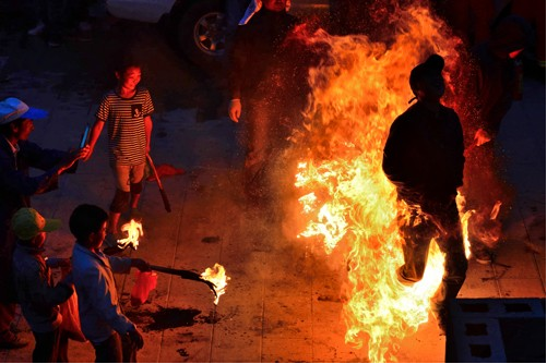 不到黃昏,鞭炮聲就響起來了。新生兒的父親點燃火把后,孩子們迫不及待地拿著小火把和松明粉,跑來跑去燒新生兒的的各種親戚,大人們樂呵呵地接受孩子們噴灑過來的火焰,并一致說著很吉祥的祈愿祝福語?!皬拇嘶逇獠辉趪D!”、“一年更比一年好呀!”、“紅紅火火又一年”。男女老少在火把樹下吃喝玩樂,其樂融融。糖、炒蠶豆、梨、蘋果等被大家傳來傳去,新生父親挨個向親友敬酒。親友鄰居喝著喜酒,一致祝福新生兒安康成長,將來富貴吉祥。