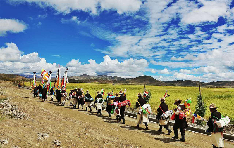 節(jié)日的第一天早晨,當(dāng)陽(yáng)光撒滿金黃麥田的時(shí)候,農(nóng)民們手持麥穗圍著農(nóng)田轉(zhuǎn)圈游行,最前邊是由喇嘛和老年農(nóng)民組成的儀仗隊(duì),高舉佛像,背著經(jīng)書(shū),吹著佛號(hào),感謝上天給人們帶來(lái)了風(fēng)調(diào)雨順的好年成。轉(zhuǎn)完麥田以后,照例要在廣場(chǎng)上舉行群眾性文娛體育活動(dòng),其中有藏戲、歌舞、跑馬、射箭、拔河等,十分熱鬧。這天,家家戶戶都要準(zhǔn)備充足的酒食,穿上最漂亮的衣服,或者在廣場(chǎng)四周的草場(chǎng)上野餐,或者在村子里邀集親朋好友宴飲。青年男女則喜歡在晚上圍著篝火跳舞,對(duì)唱情歌,直到深夜。
