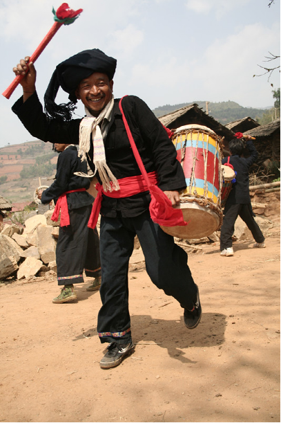 現(xiàn)今的蜂桶鼓直徑一般25—30厘米,高70—80厘米,以攀枝花樹或柳樹挖空樹心,兩端蒙上牛皮制成,形似蜂桶。鼓棒直徑3—4厘米,長(zhǎng)40—50厘米,兩端系有彩色布條。