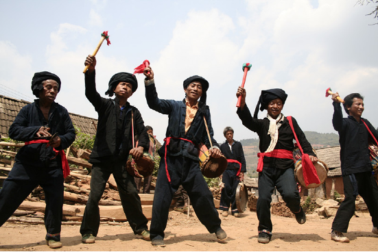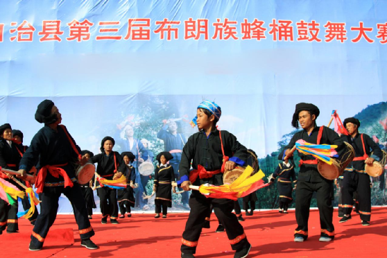 蜂桶鼓舞是布朗族的群眾性舞蹈,分為三步和五步兩種。演出時(shí),由兩名年輕男女雙手各持一條“帕節(jié)”(即毛巾)在前面跳“帕節(jié)舞”引導(dǎo),舞蹈動(dòng)作主要是甩手巾。其后是蜂桶鼓隊(duì),一般為4—6只,后緊隨2只象腳鼓,之后是6人敲打的大、中、小芒和镲,最后是跟著跳舞的人們和助興的老幼。蜂桶鼓舞的節(jié)奏明快熱烈,幾種打擊樂器相配合,“嘣咚、嘣咚……嘭嚓、嘭嚓……鏘切、鏘切……”,高、中、低音融為一體,獨(dú)具情趣。動(dòng)作大方、瀟灑、粗獷、活潑;舞姿輕盈、柔和、細(xì)膩。大南直布朗蜂桶鼓隊(duì)多次被邀赴省城和省外演出,向人們展示了本民族獨(dú)特的文化藝術(shù)風(fēng)采。
