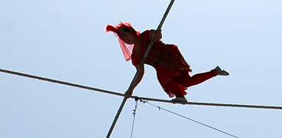 “達(dá)瓦孜”既是少數(shù)民族傳統(tǒng)體育運(yùn)動表演項(xiàng)目,也是節(jié)日里娛樂活動,它有雜技和體育的雙重特點(diǎn)?!斑_(dá)瓦孜”高空走繩表演十分壯觀,在空曠的場地上,中間聳立三十多米高的立桿,頂處扎一牌樓上掛彩旗。牌樓橫桿兩端有表演用的吊杠和吊環(huán)。表演技能的繩索長八十多米。表演者手持長約6米的平衡桿,不系保險(xiǎn)帶,在繩索上作前后走動、盤腿端坐、蒙眼行走,甚至腳踩碟子、飛身跳躍等一系列驚心動魄的動作。經(jīng)過不斷實(shí)踐和發(fā)展,“達(dá)瓦孜”表演技巧有了新突破,在濃郁民族風(fēng)味維吾爾族民間樂曲伴奏中,表演者輕松自如地在、高空繩索上踏著節(jié)拍跳舞歌唱,并且敏捷地變換著高難動作。