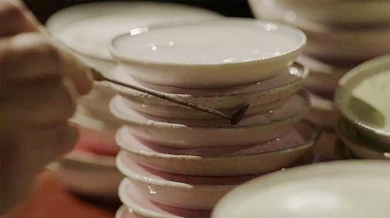 在每一個(gè)點(diǎn)藍(lán)的師傅面前,都由低到高排著一摞白色小碟,里面是摻了水的釉料。細(xì)看去,同樣是紫色,但從深紫到淺紫,竟然能分出十多種層次來。制作精良的景泰藍(lán)作品,對(duì)點(diǎn)藍(lán)要求很高。一片花瓣,要描繪顏色的漸變,就要由深入淺潤染幾個(gè)層次,才能表現(xiàn)出花朵特有的美感——這也是景泰藍(lán)的魅力所在,如果一朵花瓣只涂一二種顏色,功夫省了,景泰藍(lán)之美也消失了。