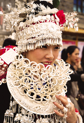 位于貴州省黔東南苗族侗族自治州臺(tái)江縣的施洞小鎮(zhèn),依仗著清水江流域便利的交通和發(fā)達(dá)的木材貿(mào)易,白銀作為貨幣在當(dāng)?shù)氐玫酱罅苛鬓D(zhuǎn)與積累。施洞地區(qū)的苗族,長(zhǎng)期保持著以銀為飾的佩戴喜好和以“盛”為美的裝飾理念。施洞苗族銀飾也因其造型最為繁麗、銀質(zhì)最為優(yōu)良、工藝最為精細(xì),從黔東南諸多苗族支系中脫穎而出,成為苗族“盛飾”的典范。
