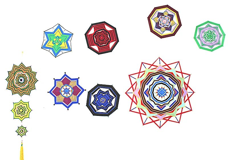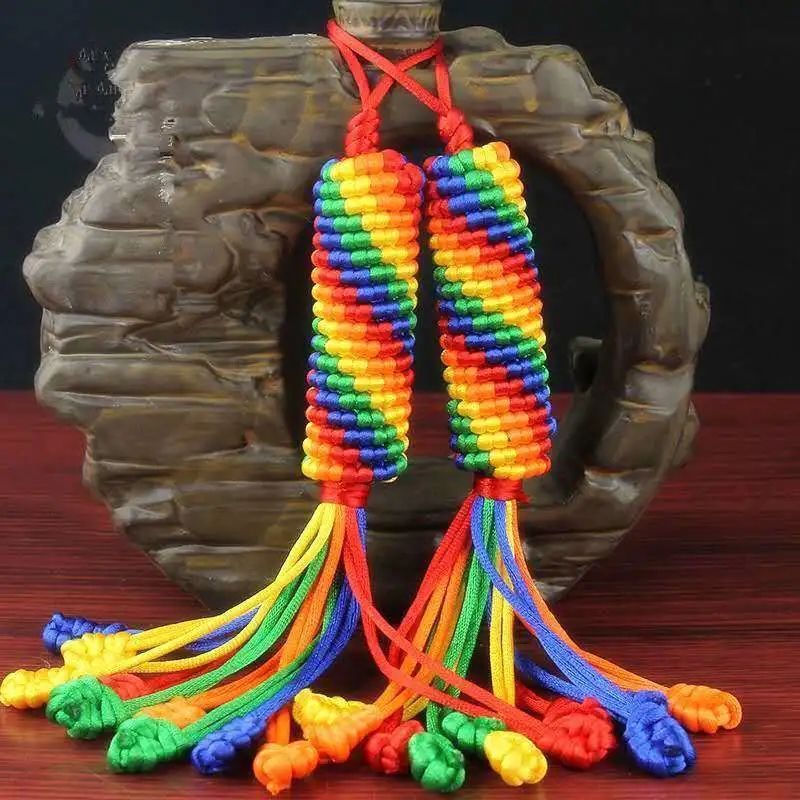 科爾沁繩編設(shè)計(jì)精巧,尤其擅長(zhǎng)表現(xiàn)游牧民族生活之美, 具有地域民族風(fēng)情之美,繩結(jié)造型多為上下一致、左右對(duì)稱、正反相同、首尾銜接。一根彩繩通過(guò)綰、結(jié)、穿、纏、繞、編、抽等多種工藝技巧,按照章法循環(huán)有致、連綿不斷編制而成。近代由于蒙漢文化的融合,繩編技法也開始相通了。