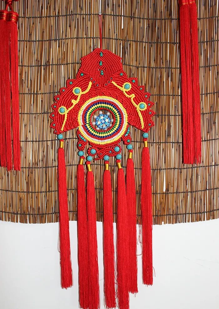 首先要選定編結(jié)材料,設(shè)計(jì)好色彩方案,用的線材可以是多種,根據(jù)需要進(jìn)行顏色搭配。編完之后,要將結(jié)子抽緊定形,這是整個(gè)編結(jié)過(guò)程中最重要也最考驗(yàn)技術(shù)的步驟。繩結(jié)在編好、抽好之后,修的工夫也不能馬虎,而注重細(xì)節(jié)。