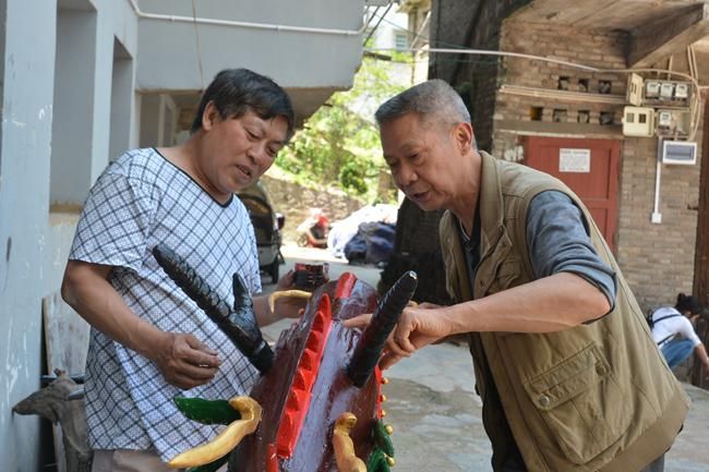 家住鎮(zhèn)遠(yuǎn)縣?陽鎮(zhèn)東關(guān)社區(qū)的皇安東,今年68歲,雖然年近古稀,但精氣神堪比五十來歲的中年人,皇安東介紹由于個人愛好,8歲時與龍舟接下了深厚的情緣,對“龍”文化研究的執(zhí)著像一如往日對戀愛的投入充滿激情和憧憬一樣,經(jīng)過60多年的龍舟文化研究探索,他手工雕刻的龍頭威武靈動融匯鎮(zhèn)遠(yuǎn)傳統(tǒng)文化精髓,“鎮(zhèn)遠(yuǎn)賽龍舟”已被列為國家非物質(zhì)文化遺產(chǎn)項目名錄。皇安東49歲開始自學(xué)雕刻龍頭,鎮(zhèn)遠(yuǎn)端午節(jié)每年祭祀用的龍頭幾乎出自他手,雕刻的龍頭已上數(shù)百頭。當(dāng)筆者提到皇安東為何歷經(jīng)六十多年對雕龍頭的“手藝”癡心不改時,他笑著爽朗地說:“我一生雕龍頭,主要的精神動力是對鎮(zhèn)遠(yuǎn)傳統(tǒng)龍舟文化的熱愛和傳承?!被拾矕|一家人整天在“龍”的藝術(shù)空間里過得有滋有味。