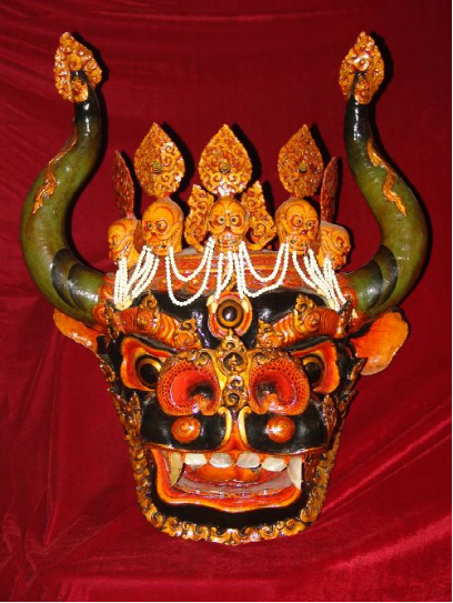 據(jù)普布次仁介紹,早在吐蕃王朝時(shí)期,西藏就有宗教舞蹈羌姆和名為“吉達(dá)吉姆”的歌舞劇。“吉達(dá)吉姆”在演出時(shí)演員要戴上白色面具,其表演的內(nèi)容是請(qǐng)求天神降雨或不要讓本地出現(xiàn)冰雹、刮大風(fēng)等自然災(zāi)害。這種歌舞劇在今天的日喀則地區(qū)仍然存在,人們常將之稱為“抗災(zāi)歌舞”。而在宗教舞蹈羌姆中,面具多數(shù)是根據(jù)佛經(jīng)及寺院殿堂中的塑像制作的,制作手法要求較高,以立體造型為主。