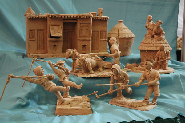 泥塑藝術(shù)是我國一種古老常見的民間藝術(shù)。它以泥土為原料,以手工捏制成形,或素或彩,以人物、動物為主。不同的民間風(fēng)俗,流傳著很多動人的傳說故事,這些構(gòu)成了泥塑藝術(shù)的精神內(nèi)核。民間泥塑的用途主要有祈子延壽、納福招財、驅(qū)邪避災(zāi)和裝飾擺設(shè)等。泥塑成本低,費(fèi)工少,是老百姓喜聞樂見的藝術(shù)表現(xiàn)形式,它往往和節(jié)令、禮儀、風(fēng)俗聯(lián)系在一起,反映的是當(dāng)?shù)剞r(nóng)村人們?nèi)粘I畹牟煌瑘鼍埃宋镨蜩蛉缟?,場景鮮活生動。