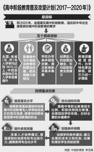 為保障普及目標的實現(xiàn),《攻堅計劃》提出了4項重點任務:一是提高普及水平。重點是提高教育基礎薄弱特別是高中階段教育毛入學率較低地區(qū)的普及程度,提高特殊群體接受高中階段教育的機會,解決有學上的問題。二是優(yōu)化結構布局。重點是提高中等職業(yè)教育招生比例,積極扶持民辦教育,合理規(guī)劃學校布局,辦好必要的鄉(xiāng)鎮(zhèn)高中,為學生提供更多選擇機會和就學便利。三是加強條件保障。重點是加強學校條件建設,建立合理的成本分擔機制,完善和落實學生資助政策,為高中階段教育發(fā)展構建長效保障機制。四是提升教育質(zhì)量。重點是改革人才培養(yǎng)模式,增強課程的選擇性和專業(yè)吸引力,提高教師專業(yè)化水平,實現(xiàn)有質(zhì)量的普及。