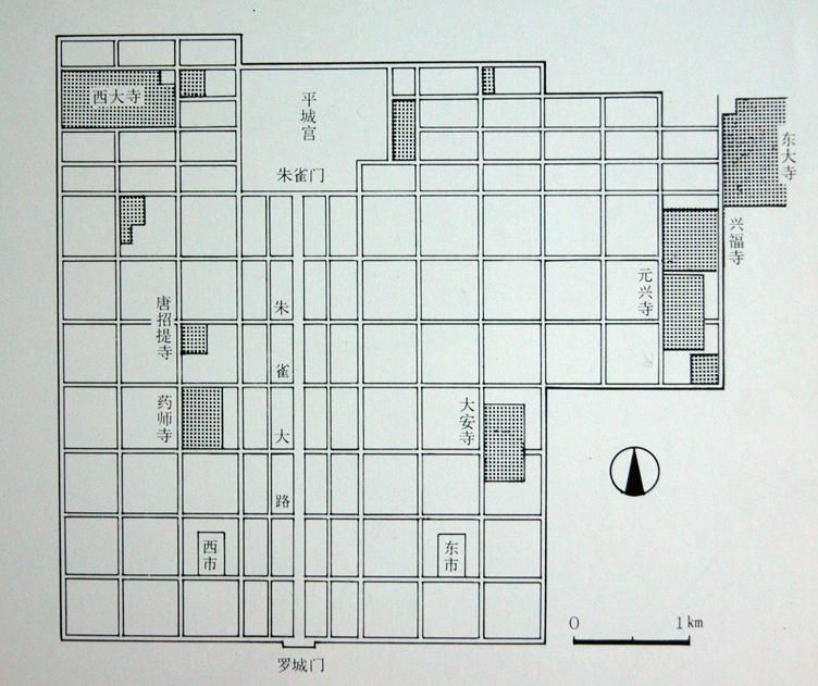 平城京在規(guī)模上繼承了藤原京,面積大致相同,東西約5.9km、南北約4.8km,其形制主要模仿唐長安城。全城平而呈長方形,宮城在北部中央。南面正中設象征性的都城正門——羅城門。羅城門與宮城的朱雀門相對,朱雀大路縱貫南北,全長約3.8km,寬72m。而此朱雀大路正好將全城分為東西兩部分,分別稱左京和右京。京城內有里坊與商市(即東市和西市)。這些設置和街道的名稱都和唐長安一模一樣,但總體面積僅為唐長安城的四分之一(圖二十一)。