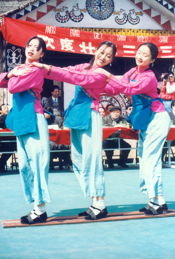壯族傳統(tǒng)的娛樂性舞蹈主要是在節(jié)日或喜慶期間舉行。類型主要為模擬勞動(dòng)舞和擬獸類舞兩種。模擬勞動(dòng)舞表現(xiàn)壯族人民的生產(chǎn)勞動(dòng)的樂趣。如紅水河流域的壯族在春節(jié)舉行的孝蛙婆活動(dòng)中所跳的撈蝦舞、捕魚舞、狩獵舞、撒秧舞、插田舞、收割舞。壯族各地流行的扁擔(dān)舞、采茶舞、繡球舞、舂堂舞、板鞋舞等。這類舞蹈的動(dòng)作舒緩柔和、抒情柔美、表現(xiàn)了農(nóng)業(yè)民族的細(xì)膩性格。擬獸類舞是模仿獸類肢體語言的一種舞蹈,此類舞蹈在壯族地區(qū)也頗為流行。最常見的是蛙舞、舞獅、舞龍、和舞春牛?;ㄉ缴系耐苄挝枳穗p手彎肘向上,兩腿半蹲成騎馬式,動(dòng)勢很大。此外,壯族各地還有螞拐舞、彩蝶舞、魚蚌舞、馬鹿舞、金雞舞等。動(dòng)作總體來說舒緩柔和、抒情柔美。但表現(xiàn)勞動(dòng)的舞蹈緊張熱烈,表現(xiàn)抗?fàn)幍奈璧复挚裼辛?,模擬動(dòng)物的詼諧逗趣,呈現(xiàn)出多姿多彩的形態(tài)。
