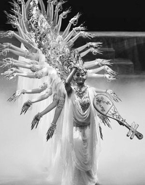在敦煌舞的動作素材積累方面,無論是對敦煌壁畫舞姿的歸類、整理,對“敦煌舞特有的S型曲線運動規(guī)律”的發(fā)現,以及“運用中國古典舞蹈的節(jié)奏韻律,把靜止的姿態(tài)與其風格統(tǒng)一的動作過程結合起來,形成比較完整的舞蹈運動和造型體系”,還是在創(chuàng)作層面上《絲路花雨》對“反彈琵琶”典型壁畫舞姿的發(fā)展,《千手觀音》對“千手”舞姿造型的無限變化發(fā)展,以及《飛天》超越人體動作范圍極限對“三道彎”典型敦煌舞姿風格的強化等,都是敦煌舞在動作素材層面的積極建設和發(fā)展。