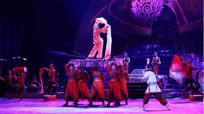 在《樓蘭尋夢(mèng)》中,既有羅馬商人、波斯商人,也有西域少數(shù)民族和漢族;既可以看到阿拉伯舞蹈,也可以看到漢族的扇子舞、綢子舞。雜技劇展現(xiàn)出多民族文化的交匯融合,是中華文化兼容并蓄的生動(dòng)體現(xiàn)。