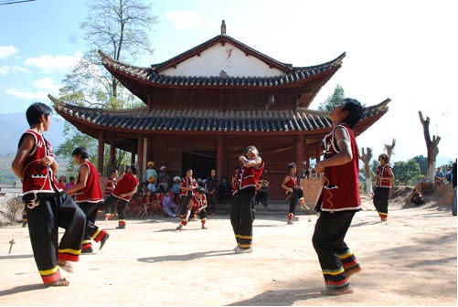 佤族同胞在雙江這片紅土地上長(zhǎng)期繁衍生息,積淀了自己獨(dú)特的生活和文化習(xí)俗。其中最彰顯佤族驃勇個(gè)性的就是體育競(jìng)技“雞棕陀螺”。雞棕陀螺迄今只為雙江佤族所獨(dú)有,在全國(guó)獨(dú)一無(wú)二。表演雞棕陀螺極富難度技巧。雞棕陀螺用質(zhì)地堅(jiān)硬的紫楊木制作,因其外觀像野生菌雞棕而得名。其表演要領(lǐng)是:
