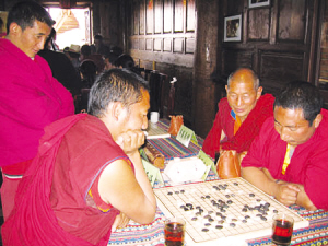 無論如何,藏棋是流傳下來了。過去,藏棋一般是在藏族上層貴族間流傳,之后也傳入了周邊尼泊爾、錫金、不丹等國(guó)。據(jù)說1958年錫金王子去日本訪問時(shí),曾與日本圍棋高手對(duì)弈一種規(guī)則奇特的圍棋,棋盤也是自帶的,引起了日本棋壇的驚異,而這位錫金王子說是學(xué)自西藏僧人。這種奇特的圍棋應(yīng)該就是藏棋。