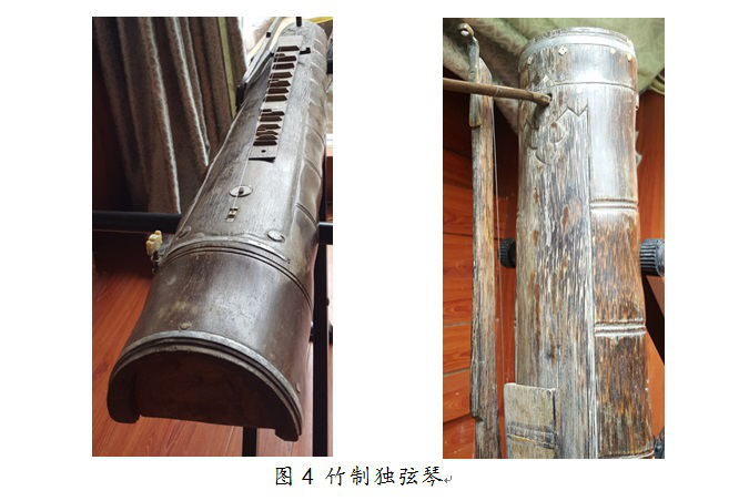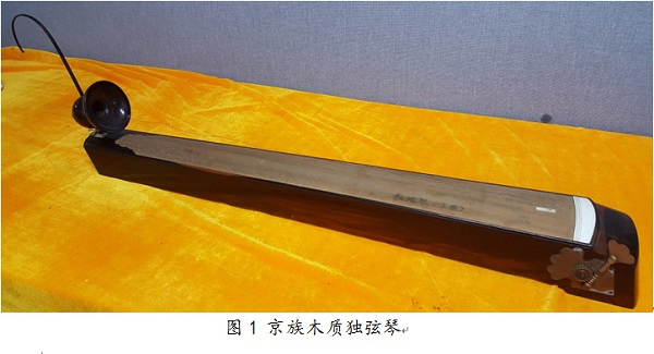 京族獨弦琴的制作工藝傳統(tǒng),其材質有竹、木質兩種。竹制獨弦琴的琴體通常取大斑竹為原料,制作時選粗細勻稱、質地密實的一段竹子,截長為120厘米左右長度,再劈成1/3和2/3兩部分,取2/3部分的竹筒進行打磨、打孔,再安裝竹制搖桿、麻繩或竹篾削制的琴弦,竹質獨弦琴即制成;木質獨弦琴的琴體多選生長于當地的桐木為原材料,取長約100-120厘米的木料,切割成數塊木板,打磨后將木板拼成長方形木匣為琴身,一端插上一根與琴身呈直角的、用牛角制成的弧形柱子,圓柱上安裝一瓢型(葫蘆形)共鳴器,再將一根金屬絲從瓢中心引向琴的另一端,固定在的弦鈕上,木質獨弦琴即制成。