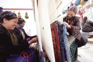 山南市瓊結(jié)縣農(nóng)牧民在襄陽(yáng)援藏工作隊(duì)引進(jìn)的西藏薩喜欽布公司編織藏毯。 湖北省民宗委供圖