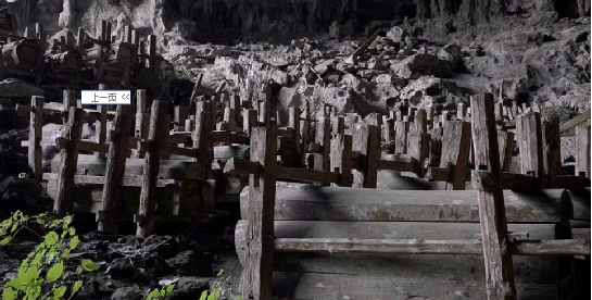 果里巖洞葬位于貴州龍里縣擺省鄉(xiāng)果里村東1公里煤洞坡的洞穴中,地處巖溶山原,峰叢林立,喬灌間雜。該洞在山頂下四十米處呈南北向橫穿山體,長580米,寬為38—65米,高為21—50米,有兩個入口;北面入口,寬54米,高21米,;南面入口,寬35米,高45米,有三道石砌墻垣。洞中地勢內斜平緩,洞內干燥,能見度好,入口處地勢外斜。據(jù)查,果里的苗族于明朝初期從貴陽遷徙而來。從遷徙之初至清末,他們均習慣將亡者殮于棺木集中存放在洞穴之內。在洞穴北面入口3000平方米的范圍內現(xiàn)存完好的棺木有192具,腐朽散落及其它原因損毀的約200余具。棺木材質為杉木。棺木有平板平頭和鼓型雄頭之分,其大小因亡者的體型而定。平板平頭型棺木制作粗糙,長1.45—2.23米,寬0.46—0.75米,高0.46——0.9米;鼓型雄頭棺木多為杉木本色,長1.5—2.23米,寬0.48—0.8米,高0.5—0.9米。棺木一律頭向北面入口,均固定于兩個或三個“井”字架上;三個“井”字架表明亡者為男性,兩個“井”字架的為女性。棺內亡者頭靠凹型木枕。平板平頭棺為明代,鼓型雄頭棺為清代。