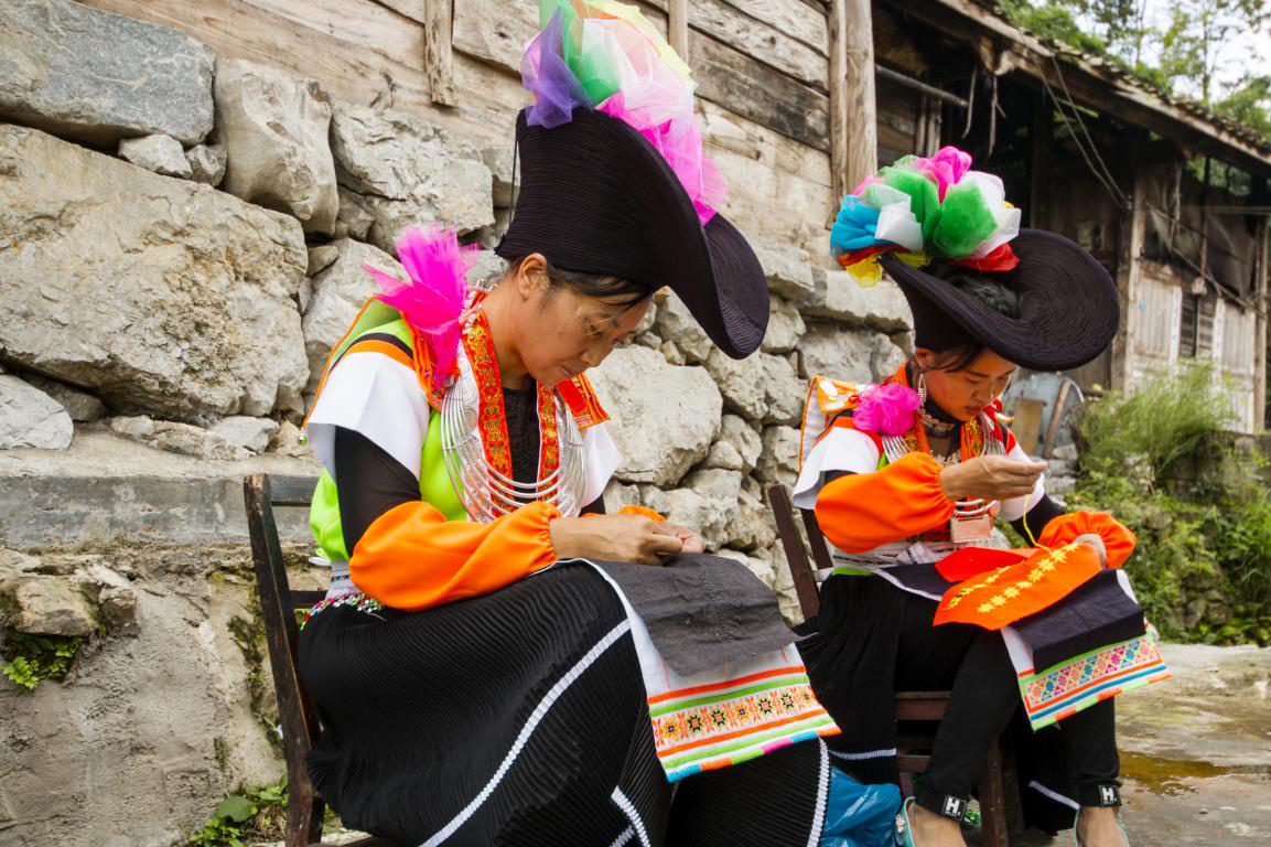 女子服飾腰間的腰帶,會連綴珠簾,給服飾整體添光加彩,使服飾整體看上去更加鮮艷亮麗。批林村人不只是在傳統(tǒng)節(jié)日當中會穿著傳統(tǒng)服飾,在日常生活中也會穿戴象征本民族的傳統(tǒng)服飾。批林村傳統(tǒng)服飾上的圖案,都來源于自己的刺繡。批林村女子刺繡圖案的多少和優(yōu)美與否,在一定程度上,標識了苗族婦女的勤勞能干,所以批林村苗族女子的刺繡圖案復雜變化,集優(yōu)美與實用一體,繡在傳統(tǒng)衣服上,顯得典雅大氣。傳統(tǒng)的刺繡一針一線,一穿一引,將處理好的麻布繡以幾何、花朵等圖案,以針線的方式賦予了苗族衣飾鮮活的生命力。