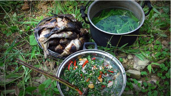 打魚(yú)湯也獨(dú)具特點(diǎn),先用缽頭盛好冷水,放入佐料和魚(yú)仔,再把洗凈的鵝卵石放進(jìn)火炭中燒的通紅,然后放進(jìn)缽里,反復(fù)多次,直至把魚(yú)湯燒開(kāi),魚(yú)仔和佐料燒熟,味道特別新鮮可口。