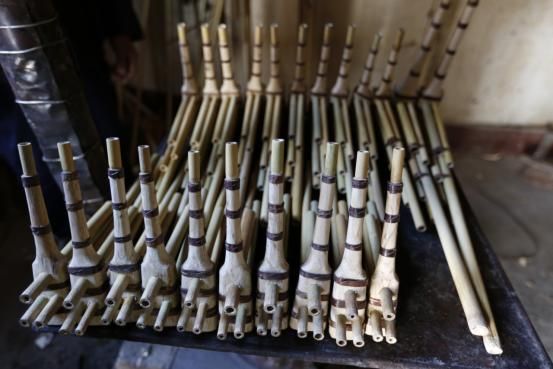 與舞臺(tái)表現(xiàn)所用的十幾管甚至二十幾管的蘆笙不同,高坡蘆笙主要是苗族傳統(tǒng)的六管蘆笙,分為大中小不同型號(hào)。蘆笙的制作材料為苦竹(蘆笙竹),原來主要產(chǎn)于貴定縣鞏固鄉(xiāng)的楊柳塘,1985年后,他們從楊柳塘將蘆笙竹移栽至高坡鄉(xiāng)批林等地,成為目前制作蘆笙的主要原料。