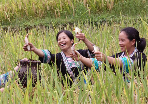 吃的時候,大家圍攏到火堆,一手拿著糯米飯,一手拿著燒鯉,撕開成片,邊蘸鹽水邊吃。男人舉杯對飲,到處是“呀-嗚-呀-嗚-”的喜慶豐收喊聲和悅耳動聽的苗歌聲,好一幅農(nóng)家樂圖畫。